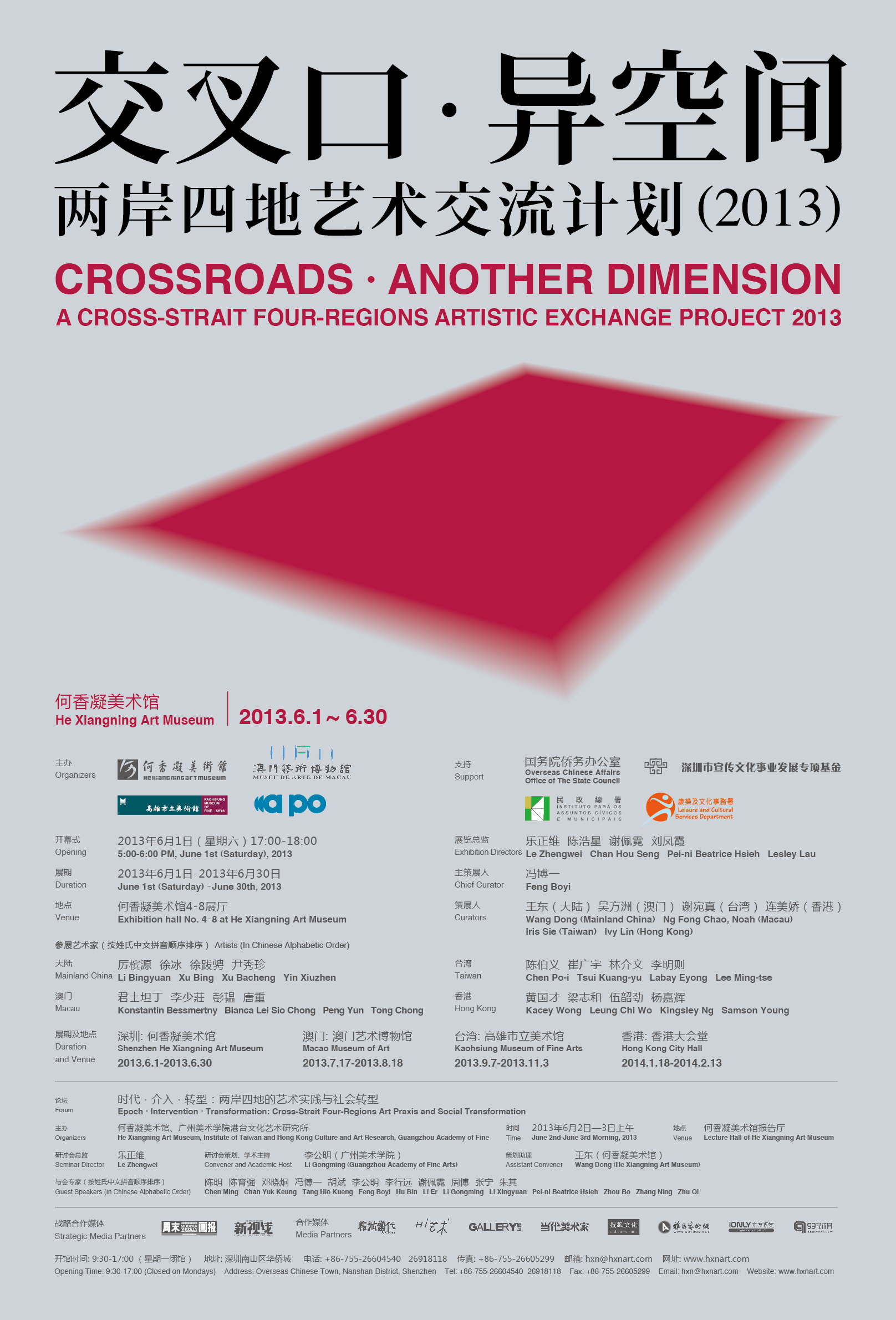 由何香凝美術館、澳門藝術博物館、高雄市立美術館、藝術推廣辦事處共同主辦,樂正維、陳浩星、謝佩霓、劉鳳霞擔任展覽總監,馮博一(主策展人)、王東(大陸)、吳方洲(澳門)、謝宛真(臺灣)、連美嬌(香港)共同策劃的“交叉口•異空間——兩岸四地藝術交流計畫(2013)”展覽將於2013年6月1日至6月30日在何香凝美術館展出。